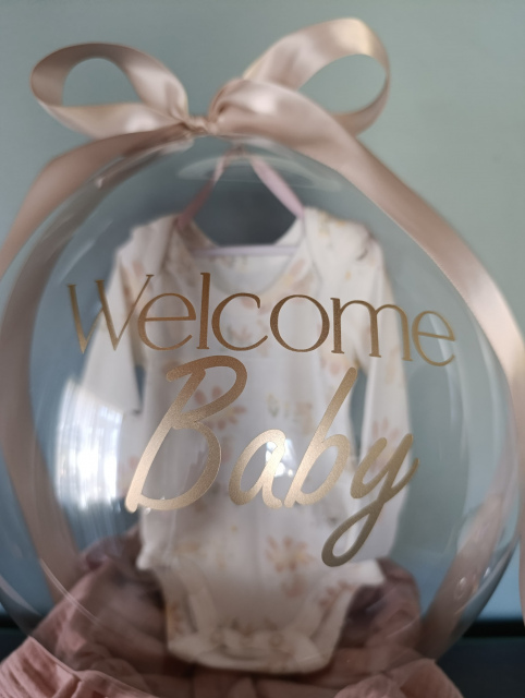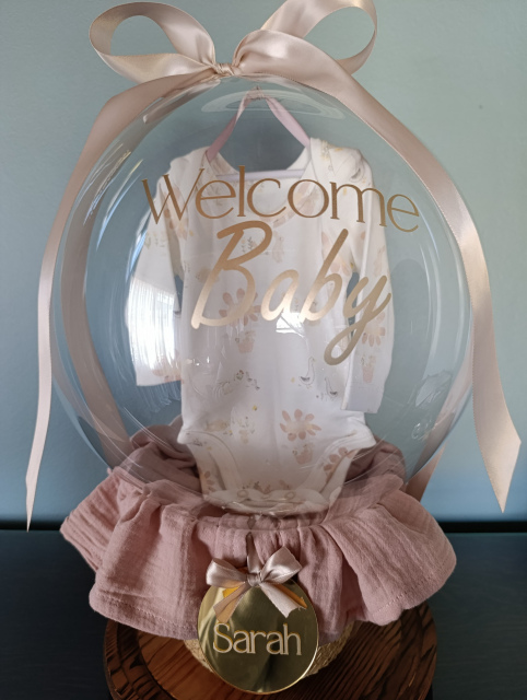 A charming and practical keepsake for welcoming a newborn. This clear Bobo balloon is styled with a soft newborn outfit and a 100% cotton muslin blanket, beautifully arranged atop a basket that can also be used as a décor piece in the baby’s room. The perfect gift for baby showers, newborn celebrations, or a thoughtful “welcome home” surprise.