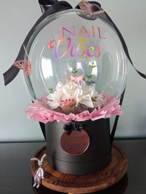 A delicate and enchanting arrangement, perfect for celebrating special moments. This clear Bobo balloon features pink and white artificial flowers and charming butterfly motifs on the outside. The design sits elegantly on a round gift box, finished with soft crepe paper at the base. Ideal for birthdays, anniversaries, or a thoughtful “just because” surprise.