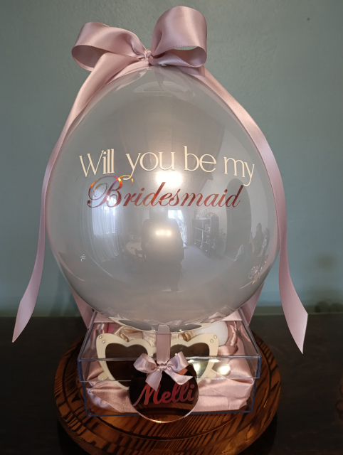 Make your bridesmaid proposal unforgettable with this elegant arrangement. A clear acrylic box holds a vibrant latex balloon and can be filled with gifts of your choice, creating a personalised and memorable keepsake. Perfect for proposals, bridal showers, or as a thoughtful thank-you gift for your bridal party.