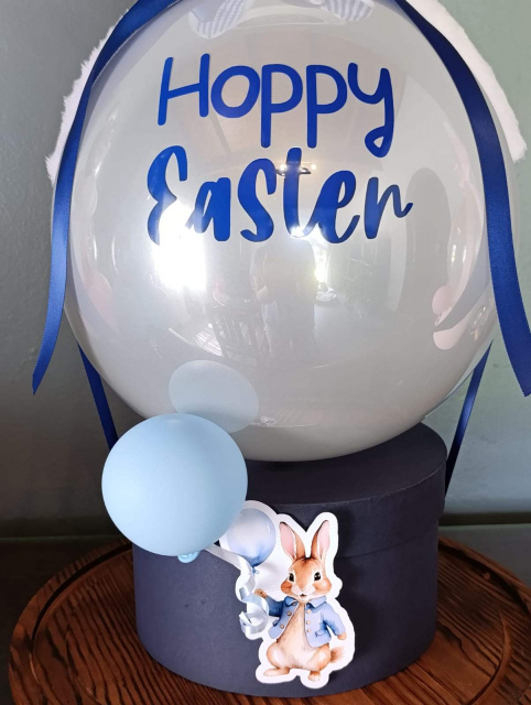 Celebrate Easter with our charming Easter Bunny Balloon Gift Box. Featuring a personalised balloon with adorable bunny ears, satin ribbon detailing, and a premium hat box base, this design makes a beautiful seasonal gift or festive decoration. Perfect for Easter surprises, egg hunts, or thoughtful gifting for little ones and loved ones.