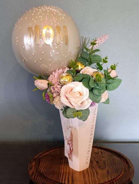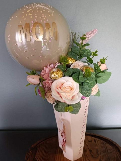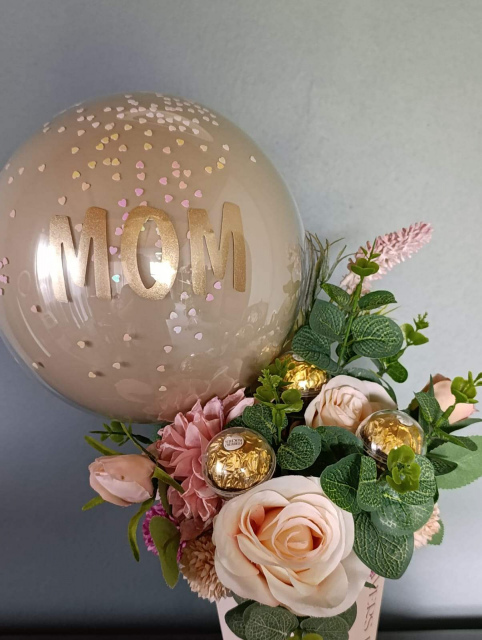 This beautifully curated arrangement features a soft neutral-toned balloon with delicate confetti detailing and “MOM” lettering, paired with a premium floral arrangement in blush and greenery tones. Finished with chocolates for a touch of luxury, this gift is perfect for showing love, appreciation, and gratitude.